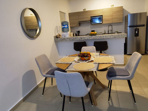 Entspannen Sie sich in einem voll ausgestatteten Apartment mit zwei Schlafzimmern für bis zu sechs Gäste in einer sicheren Wohnanlage in Puerto Morelos. Genießen Sie den Zugang zu exklusiven Annehmlichkeiten wie einem Pool, einem Fitnessstudio, einem Kinderspielplatz und einem Grillplatz sowie einem bequemen Shuttle zum Strand von Puerto Morelos. Dieses Apartment ist perfekt für Familienurlaube oder längere Aufenthalte und bietet einen komfortablen Rückzugsort in der Nähe der besten Attraktionen, Strände und kulturellen Stätten der Riviera Maya.